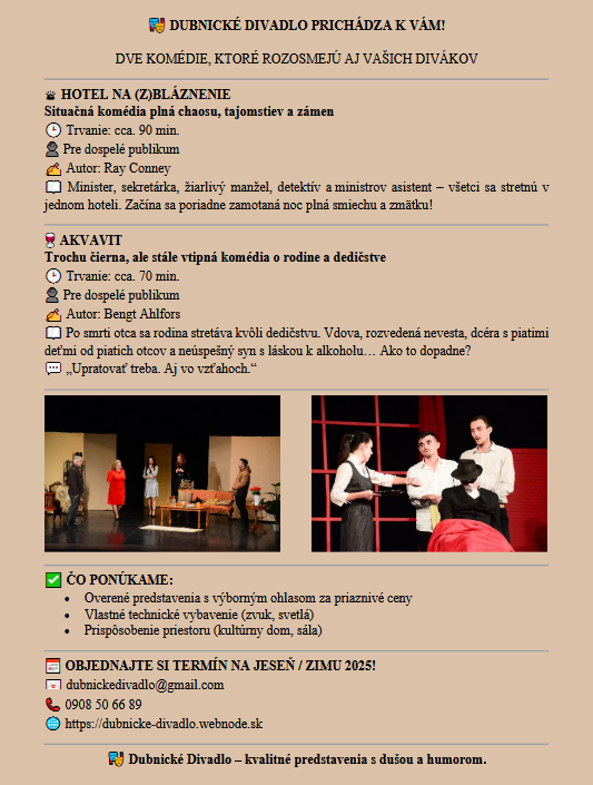 Členovia Dubnického Divadla si doposiaľ nacvičili 4 rozprávky, 1 veselohru, 6 komédií a spolupracovali na 1 muzikáli.